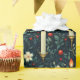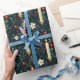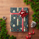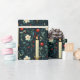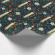 Papel de envoltura festivo con un patrón de vegetación y velas ardientes sobre un fondo oscuro.