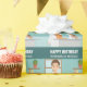 El lindo ilustracion personalizado original de Destei de un veterinario en una sala de exámenes de una clínica veterinaria. El veterinario lleva puesto un abrigo blanco de laboratorio, matorrales azules y un estetoscopio alrededor del cuello. El veterinario tiene pelo castaño y una expresión sonriente en la cara. En la pared hay una ventana y dos estantes flotantes de color marrón con una planta verde y dos jarras de medicina colocadas sobre ellas. Junto al veterinario hay un gato naranja y un cachorro de color marrón y blanco sobre una mesa de examen gris. También hay dos áreas de texto personalizables ideales para mensajes y nombres personalizados, por ejemplo.