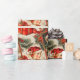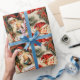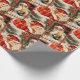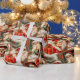 Este papel de envoltura presenta un tema vintage de Navidad, con una representación clásica de Santa Claus en el centro, sosteniendo regalos y rodeado de vegetación festiva. El diseño está formado por ramas de pino y una niña que le da un ambiente nostálgico y acogedor a las vacaciones. El fondo incorpora elementos Navidades tradicionales como cajas de regalo, vegetación con conos de pino y cintas rojas, contribuyendo a un ambiente festivo y alegre. La estética general es atemporal y anticuada, con reminiscencias de las tarjetas navideñas de principios del siglo XX.