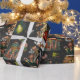 Papel de envoltura caprichoso con ilustracion pintado a mano de hongos festivos. Una seta alegre construye un muñeco de nieve frente a su casa de setas rojas. Una rana y un sapo disfrutan de una taza caliente de cacao. Y un caracol lleva un regalo de Navidades a través de un hongo y un bosque de caramelos.