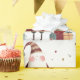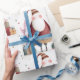 "A playful and festive wrapping paper pattern featuring a whimsical Santa Claus with a jolly smile, rosy cheeks, and a fluffy white beard. Santa is holding a stack of colorful Christmas gifts wrapped in red, green, and gold paper with ribbons and bows. The background is light blue with snowflakes, candy canes, and stars scattered around for a cheerful holiday vibe. The design is seamless and repeating, perfect for wrapping paper."
