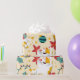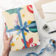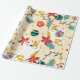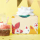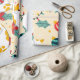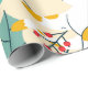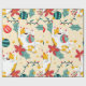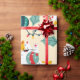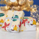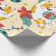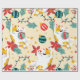 Seamless pattern with cats, Christmas ornaments, poinsettia flowers, holly leaves, and string lights on a light-yellow background. The cats are white with yellow spots and are holding Christmas ornaments. The poinsettia flowers are red with green leaves. The holly leaves are green. The string lights are multicolored. The Christmas ornaments are red and green. The background is light yellow. The style is cartoonish.
