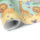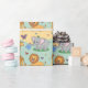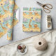 Wrapping paper featuring a playful pattern of cartoon animals, including lions, elephants, and giraffes, on a pastel yellow and blue background. The image shows both an unrolled and flat sheet, evoking a cheerful and whimsical tone.