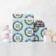 Este clásico papel de envoltura de Navidades presenta una corona de color de agua con arco azul y dice "Feliz Navidad" y personalizado con el nombre de tu familia.