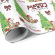 El patrón repetido en este lindo Navidad envolviendo papel es una imagen de un adorable Perro de Corgi galés de Pembroke envuelto en una cadena de luces de Navidad. El perro se sienta entre paquetes de regalo envueltos de colores junto a un árbol de Navidad decorado. Un pájaro bullfinch está aterrizando en el árbol. El texto de chapa de búfalo rojo y negro estilizado dice MERRY CHRISTMAS", y su propia firma está en dos campos para que usted lo personalizar. ¡Qué lindo!