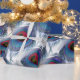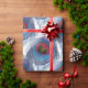 Papel de envolver elegante con hermosas plumas de pavo real de tono azul sobre fondo blanco.