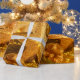 Elegantes Navidades envueltos de regalo de papel con hermosos adornos dorados (estrella, arco, perlas), conos de pino y luces de Navidades brillantes.