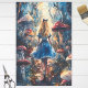 Un llamativo diseño de desunión con Alicia caminando por un sendero de bosques bordeado de setas de capucha roja, que capta el mágico encanto de la tierra de las maravillas.