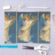 pintura vintage de un ángel con expresión angélica, hermosa vestimenta fluida y arpa dorada en azul y beige.