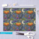 A luminous Halloween repeating pattern inspired by stained glass and Art Nouveau ornamentation. Sleek black cats with glowing green eyes sit among richly colored pumpkins, crescent moons, elegant bats, witches’ hats, and ornate spiderwebs, all outlined with flowing, leaded-glass–style contours. Set against a deep twilight blue background, the design glows with jewel tones of amber orange, violet, emerald green, and soft gold. The intricate linework and rhythmic symmetry create a refined, magical mood—dramatic and elegant rather than spooky.