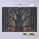 Arte de mosaico de vidrio templado del árbol de la vida. Las hojas están llenas de patrones intrincados, parecidos a los mosaicos, y los colores van desde tonos cálidos como el naranja y el amarillo a tonos fríos como el azul y el verde. Los contornos oscuros de los árboles y las hojas contrastan notablemente con los colores vivos de las formas. El fondo parece un degradado de tonos más oscuros que realza la luminosidad del efecto del cristal teñido