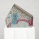 Elegante,clásico,vibrante y clásico diseño floral. Rosas rojas, rosadas ,flores azules con una paloma blanca que lleva una carta en un paisaje marino .