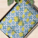 This tissue paper features a watercolor French country tile and lemon pattern in blue and yellow.