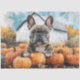Una pintura acuarela de un Bulldog francés sentado entre calabazas frente a un rústico granero blanco. Árboles de otoño enmarcan la escena con cálidos tonos dorados, creando un ambiente acogedor de temporada.