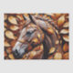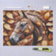 Un caballo rodeado de hojas de otoño. El diseño está decorado en tonos cálidos y terrenales de marrón, que evocan un ambiente otoñal con un ambiente rico y natural