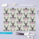 Papel de tejido estampado con una cabeza de ciervo negro con grandes antineos. Las líneas geométricas dentro de la cara del ciervo agregan un toque creativo. Flores rosas y coloridas hojas verdes de menta forman un ramo floral de bonito bajo su cabeza. Un sketch de cordillera colocado entre las flores también le da un toque rústico al campo.