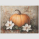 Calabaza naranja rodeada de flores de magnolia blanca.