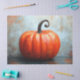 Pintura rústica vintage de una calabaza naranja brillante con tallo curling sobre un fondo texturado.