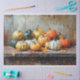 Un cuadro de estilo impresionista con una vibrante variedad de calabazas, rayadas, moteadas, naranjas, verdes y crema, artísticamente dispuestas sobre una mesa de madera angustiada. Esta composición cálida y festiva de otoño evoca el espíritu de la temporada de cosecha.