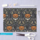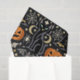 Un conjunto dramático de Halloween inspirado en el Art Déco que se repite en un fondo negro profundo, con gatos negros elegantes y estilizados con ojos verdes brillantes dispuestos en un ritmo simétrico y audaz. Los motivos clásicos de Halloween —calabazas, lunas crecientes, murciélagos, arañas, telarañas, sombreros de brujas y estrellas geométricas brillantes— se representan en formas refinadas del Déco con líneas limpias y contraste elegante. Una paleta limitada de negro tinta, naranja calabaza cálido, dorado champán y marfil suave crea un ambiente glamuroso y nocturno que se siente lujoso y sofisticado en lugar de juguetón.