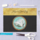 Marco dorado con un hermoso cisne blanco en un lago azul turquesa y dos rayas doradas con textura de Relieve metalizado dorado y fondo negro.