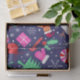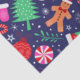 Este es un lindo patrón de navidades preppy que presenta a varios personajes Navidades como muñeco de nieve, hombre de pan de jengibre, pino y dulces con pequeños arcos y cintas sobre fondo azul oscuro. Es papel tisular lindo para la temporada de Navidades