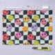 Estas son caras alegres y coloridas sobre un patrón de tableros de ajedrez blanco y negro.
