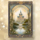 1 DE 2 IMÁGENES QUE COORDINAN, UNA CON CASTILLO, OTRA SIN. Pintura de estilo Art Nouveau victoriano de época, diseño dorado con arcos, combinado con un castillo de fantasía en una colina con un resplandor ligeramente etéreo. El borde está en un gris azul marino oscuro y polvoriento. Un tranquilo lago y un florido jardín bajo terminan el lugar. Suavemente realzada por la ephemera de escritura a mano de guiones que está sobre la imagen texturada crujiente. MSP0119-4b