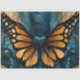 Mariposa monarca con un pequeño estilo de punk de vapor añadido en papel tisular. Las audaces alas de mariposa, naranja y amarilla, sobreestiradas en un fondo azul y dorado, hacen que este papel tisular sea bastante dramático.