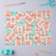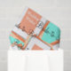 Regalo de Chubasco de Boda con floritura. Novia Próxima se escribe en escritura negra sobre múltiples capas de notas de Deseos de Boda en tonos de melón, durazno, miel y azul con pequeños corazones y XO escritos en blanco. Diseño moderno y divertido. Diseño de Arte Original por TamiraZDesigns.