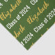 El papel tisular es verde oscuro. Todos ellos tienen un patrón de texto para el nombre del graduado y la Clase de 2024. El nombre (Mostrado: Elizabeth) aparece en un elegante guión dorado falso (no Relieve metalizado). El otro texto es blanco. Todo el texto se puede editar.