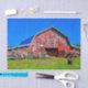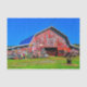 Gran granero rojo rodeado de coleccionables en un día brillante a ciegas.