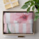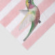 Papel de tejido de bonito, con rayas rosadas y blancas, bajo un delicado colibrí, y flor tropical hibiscus.