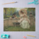 Este diseño presenta un cuadro del artista italiano Federico Andreotti (1847-1930). Muestra a una joven y elegante sentada en un banco de piedra en un parque. Está hablando con su pretendiente masculino, que se está agachando a su lado. Los dos amantes tienen una conversación romántica lejos de los ojos entrometidos de la familia y los amigos. La señora lleva un vestido blanco de moda y sostiene una sombrilla para protegerse del sol. El caballero también está usando un disfraz histórico apropiado a la época. En la banca que hay junto a la joven hay un libro que quizá contiene poesía amorosa y rosas rosas rosas que su admirador puede haber dado. La pareja está rodeada de hermosos árboles verdes. También hay un lago o un río que atraviesa el parque.