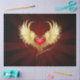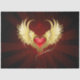 Corazón rojo brillante de un ángel con alas doradas brillando en el fondo rojo oscuro y radiante decorado con un patrón.