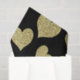 Hermoso papel de tejido con falsos corazones purpurinas de oro sobre un fondo negro. Una divertida adición para cualquiera de sus necesidades creativas o para envolver regalos.