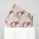 Papel tisular con un lindo dibujo en acuarelas de una madre y una jirafa de bebé. La jirafa madre está descansando su cabeza sobre la jirafa del bebé, amorosa y adorable. un ramo de flores color agua rosa, amarillo, verde y colocado debajo de este querido par. Fondo de degradado creado con una mezcla de color rosa suave en color naranja color de color claro y color de color azul.