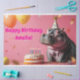 Esta deliciosa imagen capta la alegría y el capricho de un hipopótamo celebrando su cumpleaños. El adorable hipopótamo, vestido con un gorra fiesta festivo, se sitúa muy cerca de un delicioso pastel de cumpleaños adornado con velas encendidas. Globos coloridos flotan juguetonamente en el fondo, y el confeti agrega un toque de brillo a la escena.