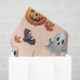 Patrón caprichoso y caprichoso de la temporada otoño de otoño con calabazas, fantasmas, murciélagos y hojas de otoño sobre un papel de envoltura de fondo color melocotón. #hallowendon #pañuelo