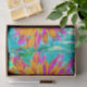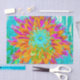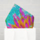 Esta pintura digital original al óleo de My Rubio Garden presenta una flor de dahlia decorativa naranja y rosa caliente con acentos de azul turquesa, magenta, turquesa, verde lima, chartreuse y aguamarina. ¡El resultado es una pintura floral de dahlia colorida, abstracta y sorprendente que te encantará!