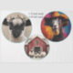 This charming farm animal trio includes two 12-inch rounds and one 10-inch round, each framed in turquoise for cohesive mixed media use. One features a black and white lamb with a floral crown, another showcases a festive goat in a cowboy hat and scarf, and the third captures three sheep in front of a snowy red barn with a holiday wreath. Perfect for decoupage, journal covers, seasonal crafting, or rustic wall décor, this set blends whimsy, Western flair, and cozy countryside charm.