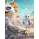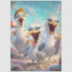 Three expressive seagulls bring beachside chaos to life in this whimsical design. One wears a leopard-print head wrap and hoop earrings, another clutches a snack mid-chomp, and the third snaps selfies with a pink phone. Set against a lively beach backdrop with umbrellas, lounge chairs, and scattered food, this scene is perfect for playful furniture art, kids’ spaces, or humorous coastal décor.