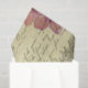 El diseño efímero incluye la antigua escritura a mano y sellos postales franceses. Hidrángulos rosados y rosas de jardín en rojo y amarillo sobre fondo amarillo envejecido.