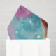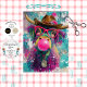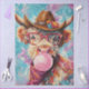 This playful decoupage paper features a charming cow dressed in full cowgirl flair—complete with a brown cowboy hat adorned with colorful flowers, red polka-dot glasses, and a purple bandana. Blowing a big pink bubblegum bubble, she radiates sass and sweetness against a vibrant splash-painted background of blue, pink, and white. Perfect for western-themed crafts with a humorous twist, this design adds personality and pop to any creative project.