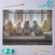 pastel chickens on windowsill, funny farmhouse bathroom art, whimsical chick photo, rustic toilet paper humor, dyed fluffy chickens indoors, cottagecore spring décor, DIY decoupage animal image, surreal farm animal scene, RHDesigns by 2ChattyChicks artwork, humorous poultry craft image