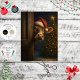 This curly-haired cow is bringing the holiday cheer—one peek at a time. Dressed in a classic red Santa hat with fluffy trim, she peeks out from behind a weathered wooden door as snow gently falls around her. In the background, a glowing Christmas tree sparkles with golden lights and ornaments, adding warmth and wonder to this rustic winter scene.