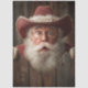 Santa Claus peeks over a rustic wooden fence, wide-eyed and surprised beneath a red cowboy hat trimmed in white fur. His gloved hands grip the fence as dark wood planks frame the scene, blending traditional holiday charm with Western flair. Perfect for decoupage, mixed media, or furniture art that celebrates Christmas with a playful, rustic twist.