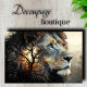 Transforma tus proyectos creativos con el papel decoupage de león premium de Decoupage_Boutique. Este diseño místico presenta un león noble de perfil con ojos azules y ámbar llamativos, su majestuoso rostro superpuesto con un árbol de acacia en silueta contra una puesta de sol ardiente, creando un efecto artístico de doble exposición. Este diseño crea un punto focal elegante perfecto para espacios espirituales, centros de bienestar o espacios inspirados en safaris. COMBINACIONES DE COLORES: ámbar dorado, naranja atardecer, negro medianoche, blanco marfil y azul celeste realzan la belleza natural. CARACTERÍSTICAS DEL DISEÑO: técnica artística de doble exposición, efectos de iluminación etérea y expresión animal emotiva aportan profundidad a tus proyectos. PERFECTO PARA: accesorios de meditación, cajas de joyas, arte mural, retiros de bienestar, lodges de safari y artículos de regalo espirituales. Ideal para una variedad de proyectos grandes y pequeños.