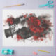 La imagen muestra a una pareja de bodas esqueletos en un abrazo romántico. El novio está vestido con un traje negro con colas, un sombrero de alto, mientras que la novia lleva un vestido blanco y florido adornado con flores rojas. Ambos esqueletos tienen detalles de rasgos faciales blancos que parecen maquillaje o máscaras. El fondo está repleto de toques de colores vivos que realzan el ambiente festivo y gótico. Esta obra combina maravillosamente temas de amor, celebración y estética gótica.