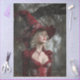 Mystical witch woman red gown forest, red witches hat feathers winter scene, gothic holiday fantasy illustration print, snowflakes misty enchanted woodland setting, dramatic lighting magical seasonal portrait, ethereal forest witch-inspired design, bold red costume winter charm, rustic mystical Christmas art piece, fantasy storytelling festive forest image, whimsical gothic holiday collection.